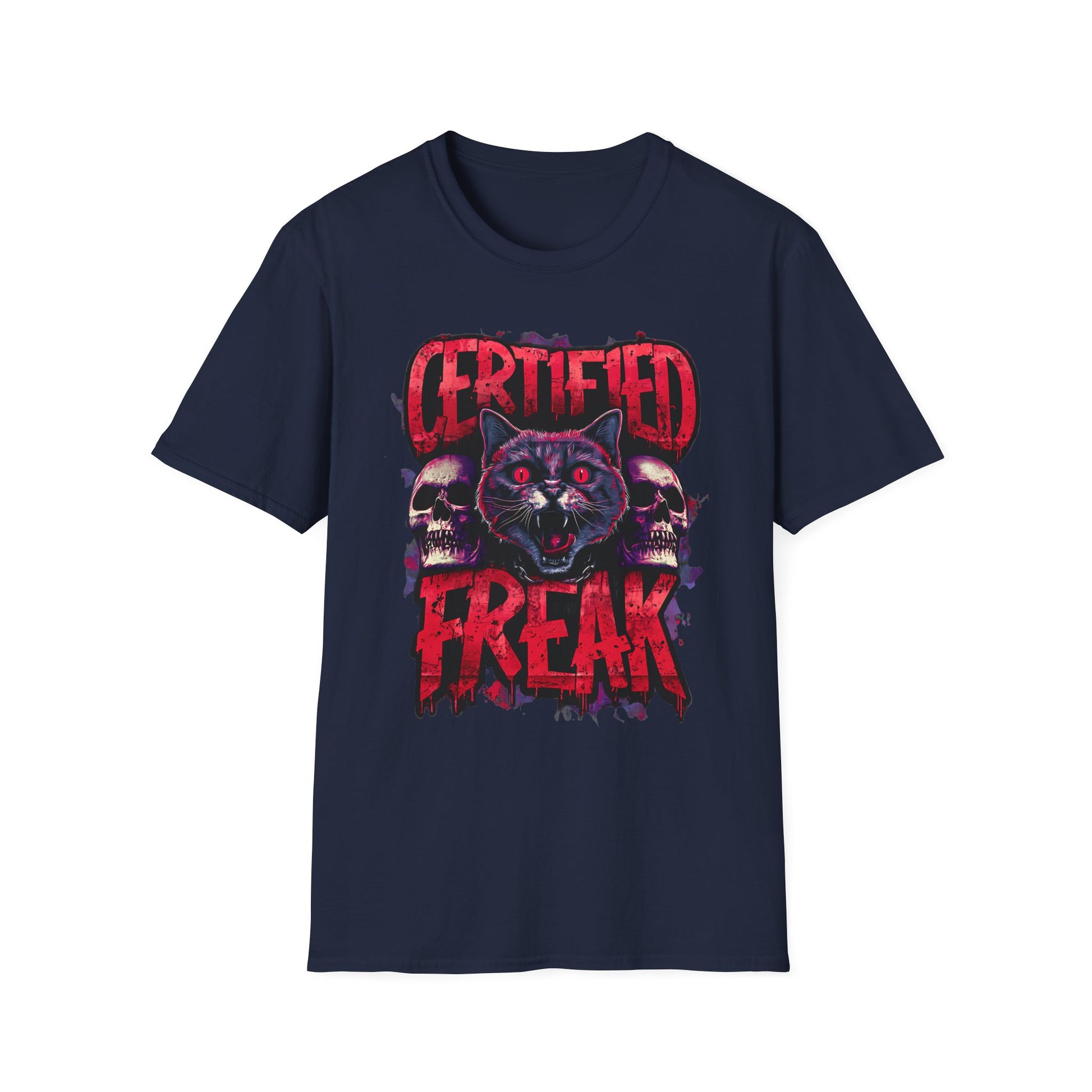 Make a bold statement with this Certified Freak Cat t-shirt. Featuring a fierce black cat with glowing red eyes and skull accents, this tee is perfect for cat lovers who enjoy dark, edgy, and unique designs. Great for concerts, Halloween, or anyone with a wild side.
