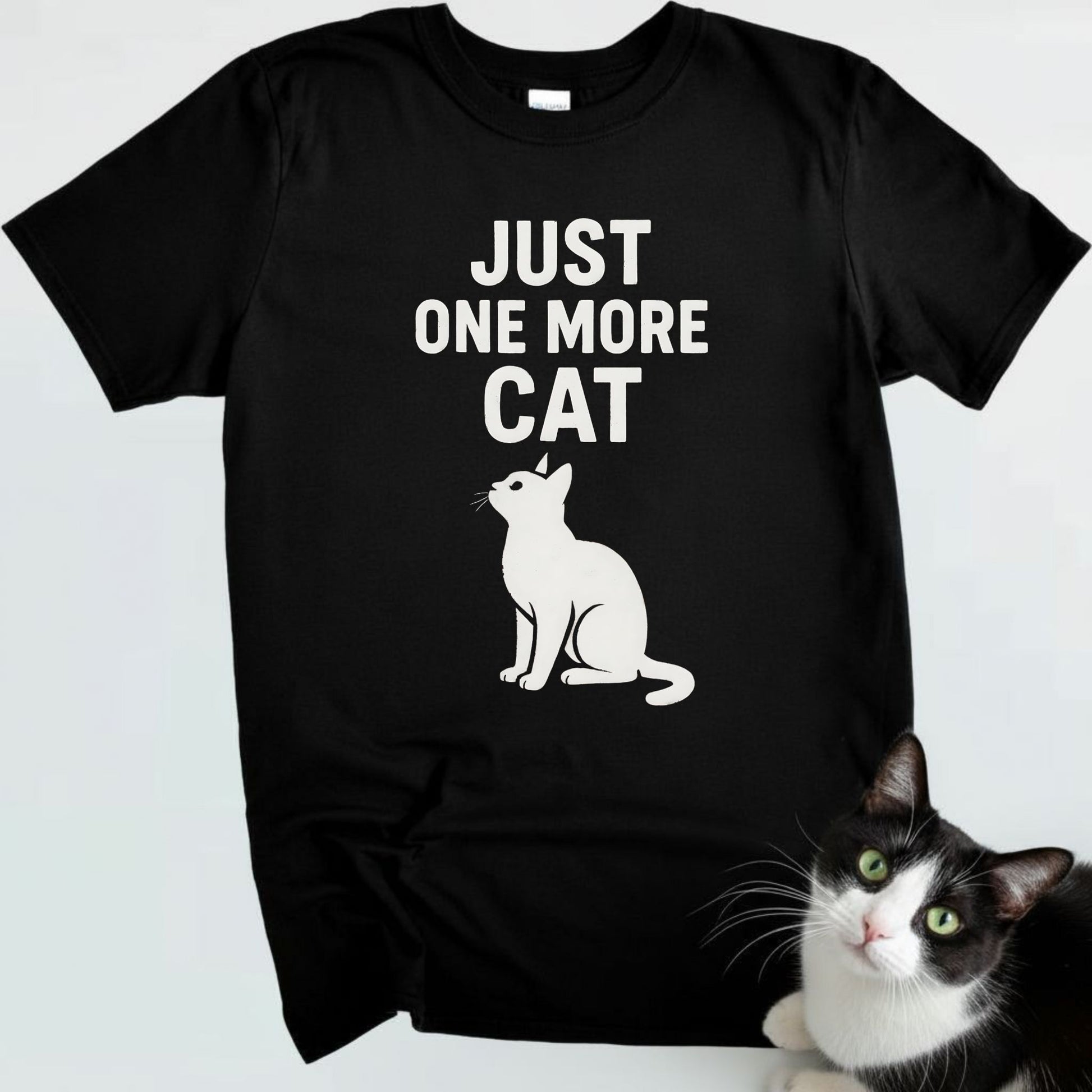 For every cat lover who can’t resist adding to the family, this tee says it perfectly: “Just One More Cat.” Featuring a minimalist white cat illustration with bold lettering, it’s a playful design that speaks to the heart of every feline enthusiast. A fun gift for proud cat moms, cat dads, and anyone who dreams of one more kitty.