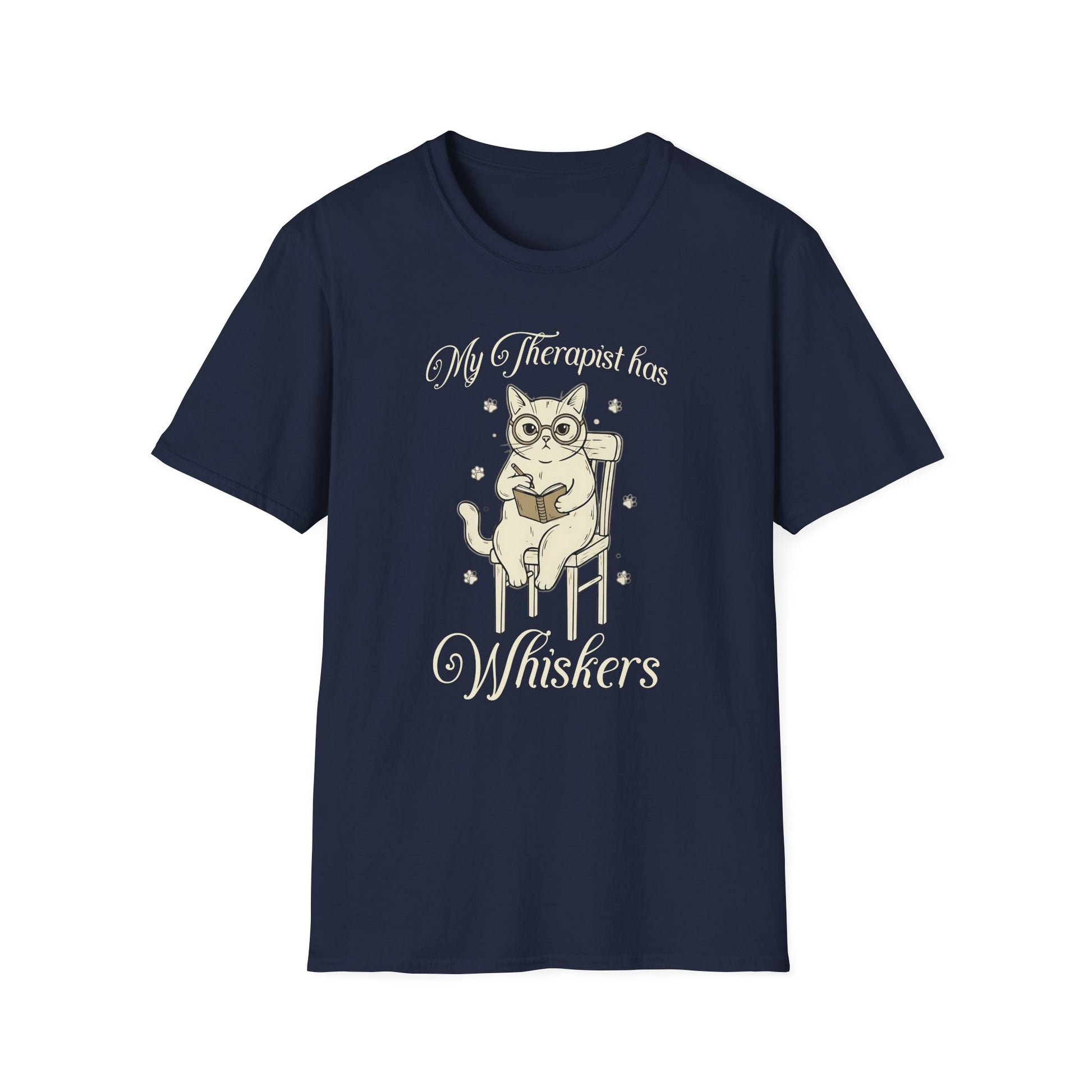 Show your love for feline therapy with this My Therapist Has Whiskers t-shirt. Featuring a cute cat with glasses and a book, this comfy tee is perfect for proud cat owners who know their pet is the best therapist. Makes a thoughtful and funny gift for cat lovers everywhere.